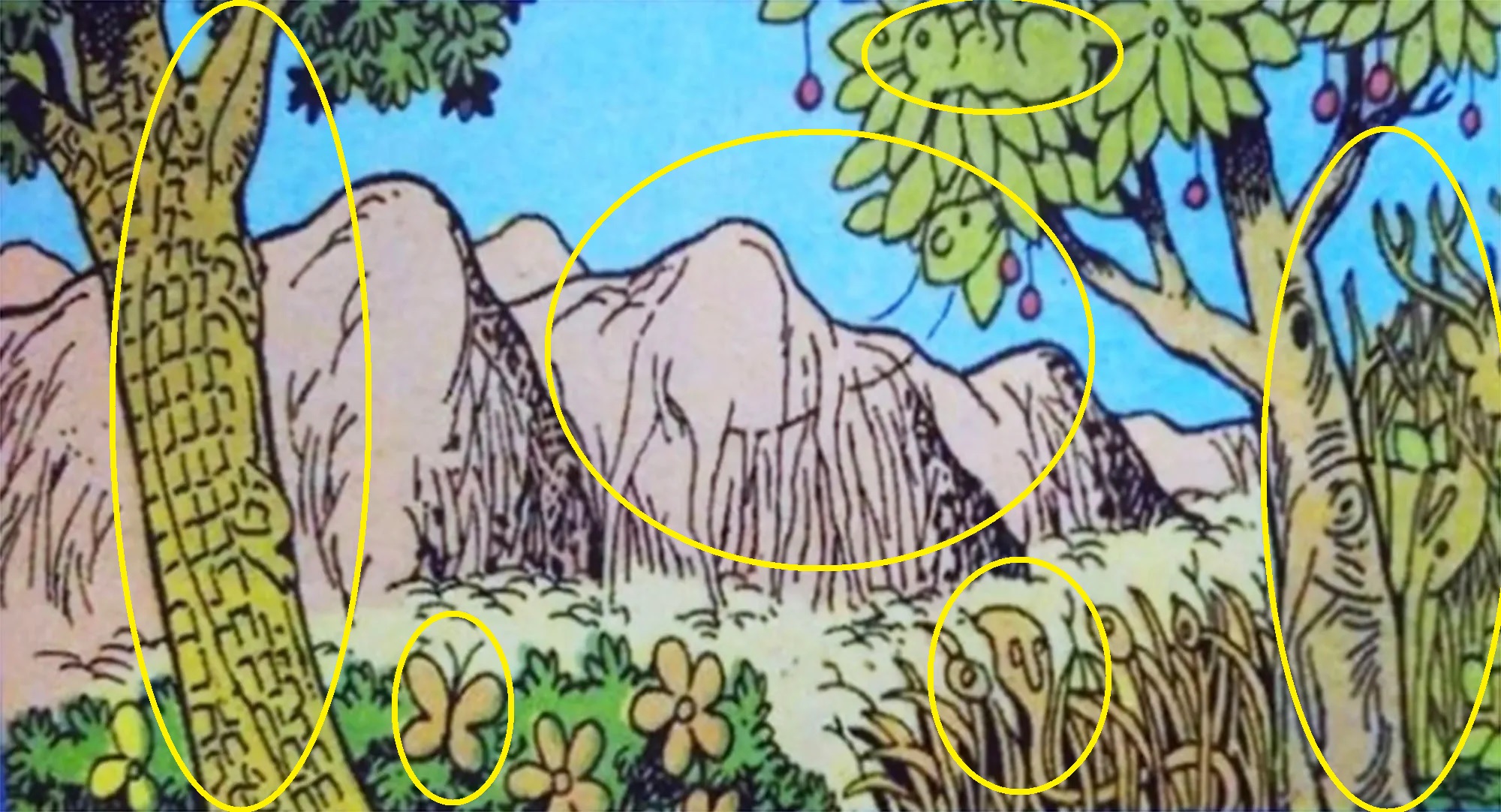 Εκ πρώτης όψεως, η εικόνα μοιάζει με ένα συνηθισμένο τοπίο που διαθέτει βουνά, χορτολιβαδικές εκτάσεις, δέντρα και θάμνους. Ωστόσο, με μια πιο προσεκτική ματιά γίνεται σαφές ότι η εικόνα κρύβει έξι ζωάκια.