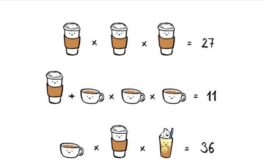 Στην πρώτη σειρά βλέπουμε τρία ποτήρια του καφέ, τα οποία αν πολλαπλασιαστούν μεταξύ τους μας δίνουν τον αριθμό 27. Έτσι, αν ονομάσουμε ως Χ το κάθε ποτήρι του καφέ, η πράξη παίρνει την εξής μορφή: