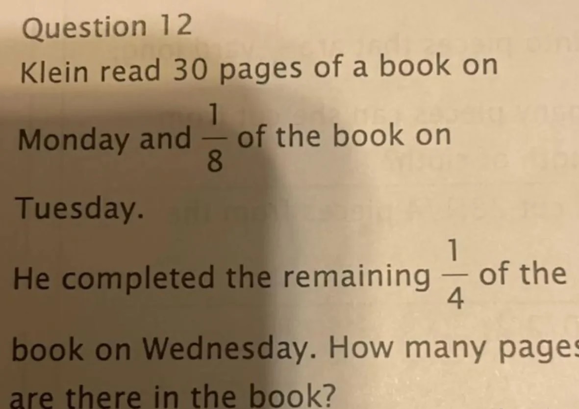 «Ο Κλάιν διάβασε 30 σελίδες ενός βιβλίου τη Δευτέρα και το 1/8 του βιβλίου την Τρίτη. Ολοκλήρωσε το υπόλοιπο 1/4 του βιβλίου την Τετάρτη. Πόσες σελίδες υπάρχουν στο βιβλίο;»