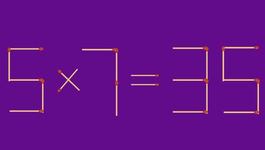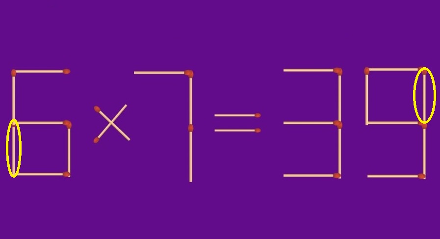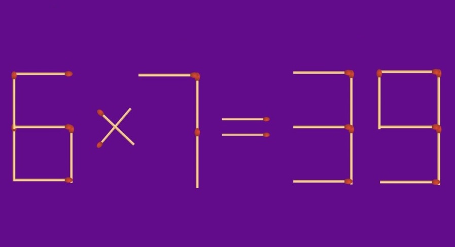 Το παρακάτω μαθηματικό παζλ εμφανίζεται η εξίσωση «6×7=39», με τα νούμερα και τα μαθηματικά σύμβολα να είναι κατασκευασμένα εξ ολοκλήρου από σπίρτα. Η εξίσωση είναι λάθος καθώς «6×7=42». Αυτό που πρέπει να κάνετε είναι να διορθώσετε αυτήν την εξίσωση για να είναι σωστό το αποτέλεσμα, αφαιρώντας μόνο δύο σπίρτα.