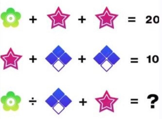 Συγκεκριμένα, το τεστ μοιράστηκε το προφίλ του Instagram «Math Quiz, Game and Puzzles». Το πρόβλημα είναι «απλό»: Εάν η αξία τριών λουλουδιών είναι 36, ενός λουλουδιού και δύο αστεριών 20 και ενός αστεριού και δύο διαμαντιών 10, τότε ποιο νούμερο θα προκύψει εάν ένα λουλούδι διαιρεθεί με ένα διαμάντι και προστεθεί με ένα αστέρι;
