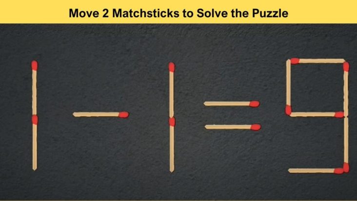 Το παρακάτω μαθηματικό παζλ εμφανίζεται η εξίσωση «1-1=9», με τα νούμερα και τα μαθηματικά σύμβολα να είναι κατασκευασμένα εξ ολοκλήρου από σπίρτα. Η εξίσωση είναι λάθος καθώς «1-1=0». Αυτό που πρέπει να κάνετε είναι να διορθώσετε αυτήν την εξίσωση για να είναι σωστό το αποτέλεσμα, μετακινώντας μόνο δύο σπίρτα.