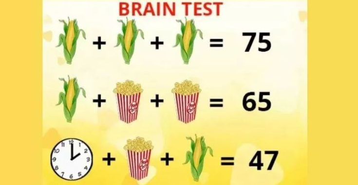 Στην πρώτη σειρά, θα δείτε τρία καλαμπόκια, τα οποία προστίθενται μεταξύ τους και δίνουν σαν αποτέλεσμα τον αριθμό 75. Η δεύτερη σειρά αποτελείται από ένα καλαμπόκι και δύο κουβάδες ποπ κορν τα οποία ισοδυναμούν με τον αριθμό 65. Στην τρίτη σειρά φαίνεται ένα ρολόι, ένας κουβάς για ποπ κορν και ένα καλαμπόκι τα οποία συνολικά δίνουν τον αριθμό 47. Στην τέταρτη και τελευταία σειρά καλείστε να βρείτε το αποτέλεσμα που θα προκύψει αν προσθέσουμε τρία καλαμπόκια με έναν κουβά ποπ κορν τον οποίο έχουμε πολλαπλασιάσει με ένα ρολόι.
