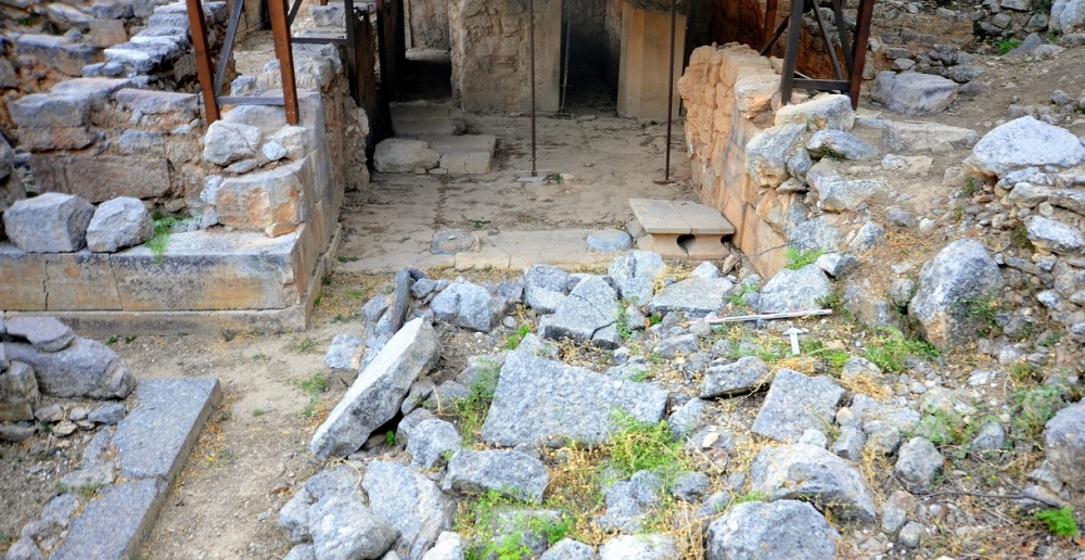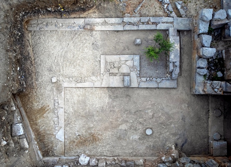 Ενδιαφέρον έχει επίσης μία λίθινη βάση, που αποκαλύφθηκε κάτω από τους ογκώδεις λίθους στα νότια της εισόδου με τους τέσσερις βωμούς. Η βάση ήταν πεσμένη από άνω όροφο μαζί με λείψανα καμένου ξύλου και τέσσερα ιδιαίτερα χάλκινα αντικείμενα/γάντζους, εύρημα που οδηγεί στην υπόθεση, ότι αποτελούσαν συνδέσμους σε ένα ξύλινο ξόανο, το οποίο στηριζόταν πάνω σ’ αυτήν. Πρόκειται για ένα στοιχείο που δείχνει, ότι ο άνω όροφος ενός δωματίου στα ανατολικά της αυλής είχε ιερό χαρακτήρα.