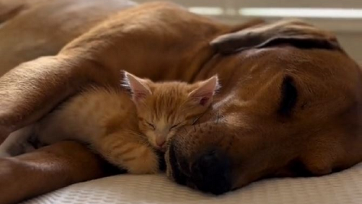 Δεν χρειάστηκε καθόλου χρόνος για να έρθουν κοντά. Ήταν σαν να ήταν αδελφές ψυχές από κάποια προηγούμενη ζωή. Από την στιγμή που γνωρίστηκαν, μέσα σε λίγες μέρες έγιναν αχώριστοι. Όπως θα δείτε και στο παρακάτω βίντεο το οποίο έχει εκατομμύρια προβολές στο TikTok, η γάτα χάνεται στην αγκαλιά του σκύλου και κοιμούνται μαζί.