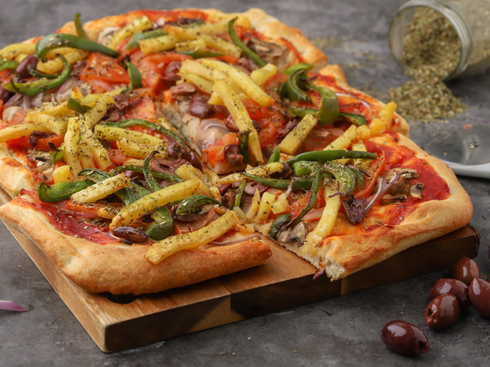 - Απλώνουμε τη σάλτσα πίτσας στην επιφάνεια της ζύμης και προσθέτουμε τις ντομάτες, τις πιπεριές, τις ελιές, το κρεμμύδι, τα μανιτάρια και τις πατάτες. Πασπαλίζουμε με τη ρίγανη, αλατοπιπερώνουμε και ψήνουμε για 10-15 λεπτά, μέχρι να χρυσαφίσει η ζύμη και να λιώσουν τα τυριά. Επαναλαβάνουμε την ίδια διαδικασία για την υπόλοιπη ζύμη.