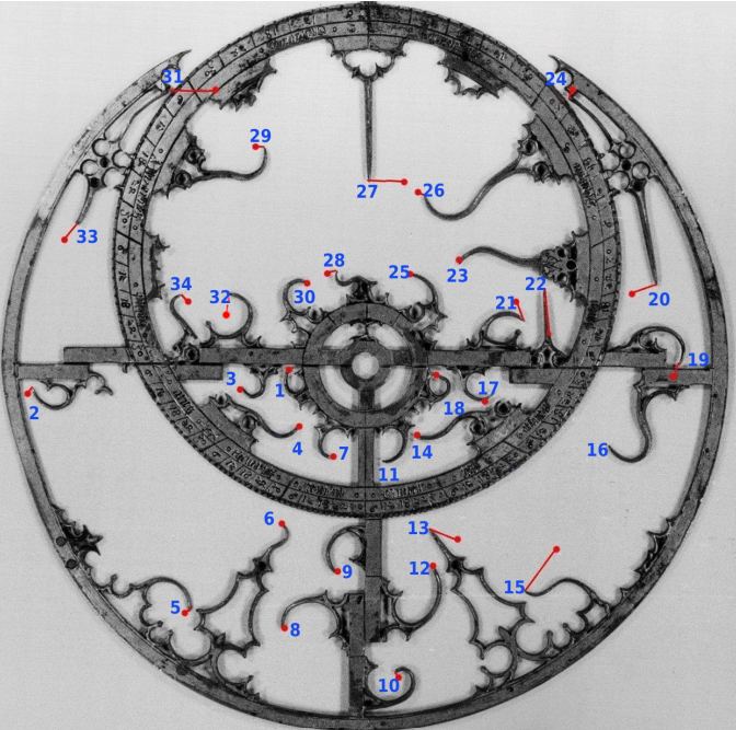 Αλλά ίσως το πιο σημαντικό, οι αστρολάβοι έχουν “δείκτες” που, όταν τοποθετούνται στον ουρανό, θα αντιπροσωπεύουν τη θέση ενός συγκεκριμένου συνόλου άστρων. Ο αστρολάβος που μελέτησε ο Dr. Davoust έχει 34 τέτοιους δείκτες.
