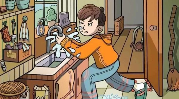 Στην παρακάτω εικόνα μπορείτε να δείτε ένα παιδί που προσπαθεί να σταματήσει μία διαρροή νερού στην κουζίνα. Κάπου βρίσκεται μία χτένα. Μπορείτε να την βρείτε σε μόλις 10 δευτερόλεπτα;