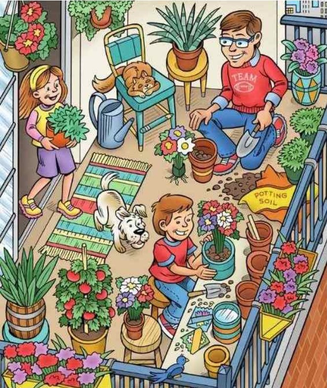 Στην παρακάτω εικόνα μπορείτε να δείτε δύο παιδιά να κάνουν κηπουρική στο μπαλκόνι με τον πατέρα τους. Κάπου κρύβεται μία κάμπια. Μπορείτε να την βρείτε σε 8 δευτερόλεπτα;