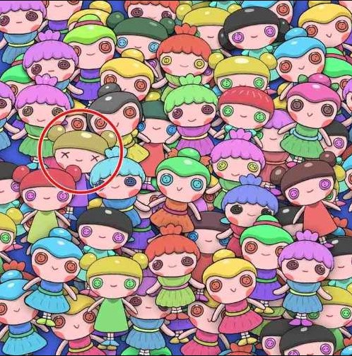 Στην παρακάτω εικόνα μπορείτε να δείτε πολλές κούκλες που έχουν κουμπιά για μάτια. Κάπου βρίσκεται μία κούκλα που δεν έχει αυτά τα κουμπιά. Μπορείτε να την βρείτε σε 6 δευτερόλεπτα;