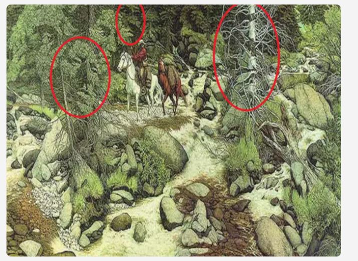 Υπάρχουν 13 κρυμμένα πρόσωπα σε αυτή την εικόνα στην οποία φαίνονται δύο αναβάτες αλόγων σε ένα δάσος σε κάποιο βουνό. Αυτή η οπτική ψευδαίσθηση δημιουργήθηκε από τον Bev Doolittle και είναι γνωστή ως “The Forest Has Eyes”.