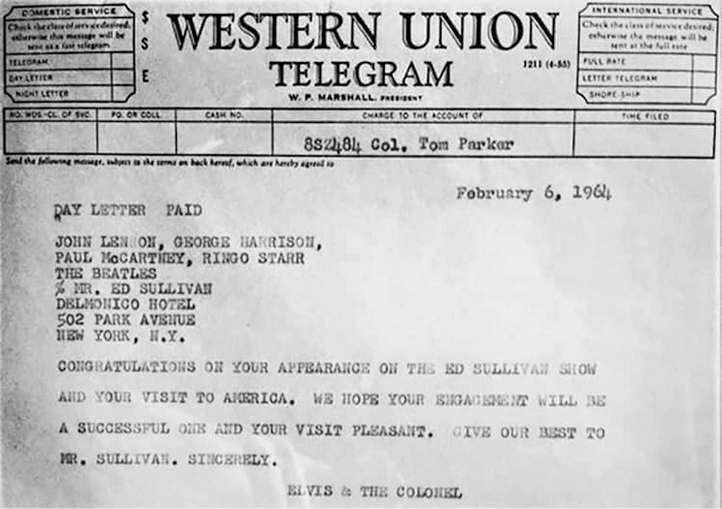 Ο Parker πράγματι φάνηκε εξ αρχής διατεθειμένος να βοηθήσει, με δική του σύσταση οι Beatles εμφανίστηκαν στο πολύ δημοφιλές “Ed Sullivan Show” στις 6 Φεβρουαρίου 1964. Μισή ώρα πριν την εμφάνισή τους, παραδόθηκε στα “σκαθάρια” ένα τηλεγράφημα από τον Elvis και τον μάνατζερ του, που έλεγε: «Συγχαρητήρια για την εμφάνισή σας στο “Ed Sullivan Show” και την επίσκεψή σας στην Αμερική. Ελπίζουμε να έχετε επιτυχία και ευχάριστη διαμονή. Δώστε τους χαιρετισμούς μας στον κ. Ed Sullivan. Elvis και ο Colonel».