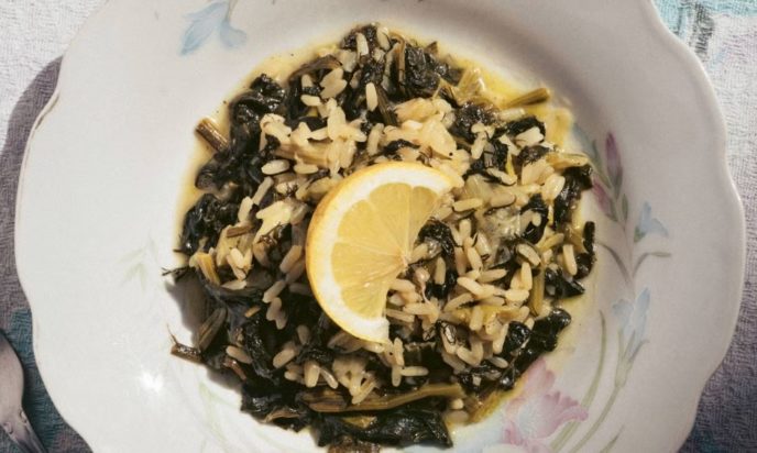 “Στο σπίτι μας, μαγειρεύουμε σπανακόρυζο στη σκιά των πορτοκαλιών στον κήπο της. Βρίσκουμε τη μέθοδο της Σούλα για το πλύσιμο του σπανακιού – μέσα σε μια τεράστια λεκάνη με ένα λάστιχο νερού – εξαιρετικά διασκεδαστική και θα το δοκιμάσουμε στο σπίτι. Αυτό το πιάτο είναι ένα είδος ριζότο, αλλά σε γνήσιο ελληνικό στιλ, τα λαχανικά είναι ο πρωταγωνιστής της παράστασης και είναι πολύ λιγότερο περίπλοκο στην παρασκευή από ένα παραδοσιακό ιταλικό ριζότο (ποιος έχει χρόνο για όλο αυτό το τριγύρισμα και το ανακάτεμα;). Ένα ολόκληρο μάτσο άνηθου που προστίθεται στην κατσαρόλα μας φέρνει ένα φρέσκο άρωμα λιβαδιού στον κήπο και το σερβίρουμε με ένα μεγάλο κομμάτι φέτα και μια φέτα από ζουμερό λεμόνι”.