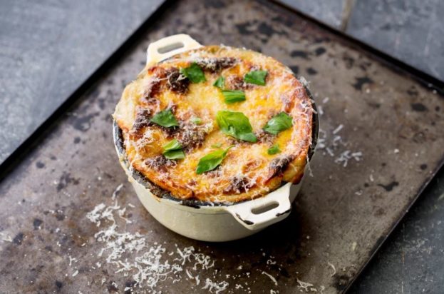 - Αν χρησιμοποιείτε ατομικά σκεύη, κόψτε τα φύλλα λαζανιών προσεκτικά για να χωράνε στο σκεύος (3 ή 4 στρώσεις).