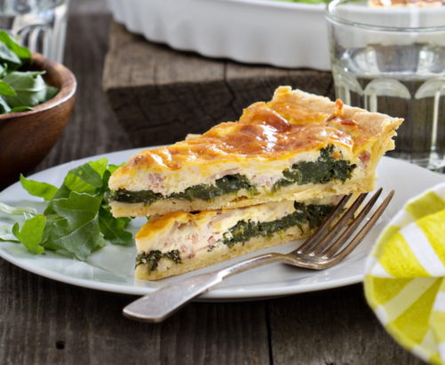 Αυτή η Κις Λορέν (Quiche Lorraine) με ζαμπόν και σπανάκι είναι ιδανική για κάθε γεύμα της ημέρας. Αυτή η συνταγή δεν περιλαμβάνει ζύμη, γεγονός που την καθιστά εξαιρετικά εύκολη στην προετοιμασία. Επίσης, μπορείτε να αντικαταστήσετε το τσένταρ με γκούντα ή να χρησιμοποιήσετε σέσκουλο αντί για σπανάκι προκειμένου να δώσετε μια διαφορετική γεύση.