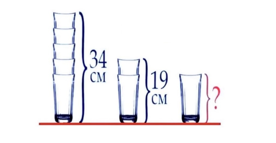 Το παζλ σας ζητάει να βρείτε το ύψος ενός ποτηριού για σφηνάκια, έχοντας ως ύψος πέντε ποτηριών που είναι στοιβαγμένα είναι 34 εκατοστά και το ύψος δυο ποτηριών που είναι στοιβαγμένα το ένα μέσα στο άλλο είναι 19 εκατοστά.