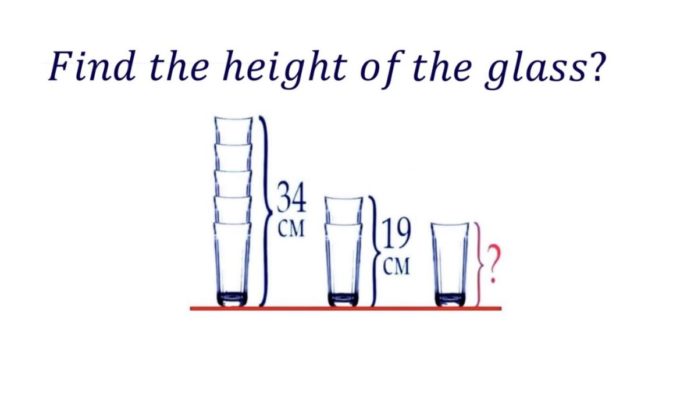 Το παζλ σας ζητάει να βρείτε το ύψος ενός ποτηριού για σφηνάκια, έχοντας ως ύψος πέντε ποτηριών που είναι στοιβαγμένα είναι 34 εκατοστά και το ύψος δυο ποτηριών που είναι στοιβαγμένα το ένα μέσα στο άλλο είναι 19 εκατοστά.