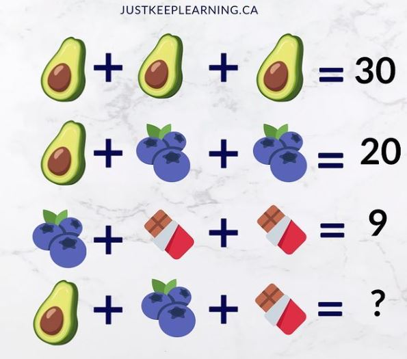 Το τεστ, το οποίο αναρτήθηκε στα μέσα κοινωνικής δικτύωσης από το προφίλ “justkeeplearning.ca“ παρουσιάζει μία σειρά πράξεων, κάθε μία από τις οποίες έχει και ένα διαφορετικό αποτέλεσμα. Η μόνη διαφορά είναι πως αντί για αριθμούς οι πράξεις αποτελούνται από τρόφιμα. Σκεφτείτε ποιες μαθηματικές πράξεις πρέπει να κάνετε ώστε να βρείτε πόσο αξίζει το κάθε τρόφιμο και τελικά να προσθέσετε τις τιμές τους για να βρείτε τον αριθμό που λείπει.