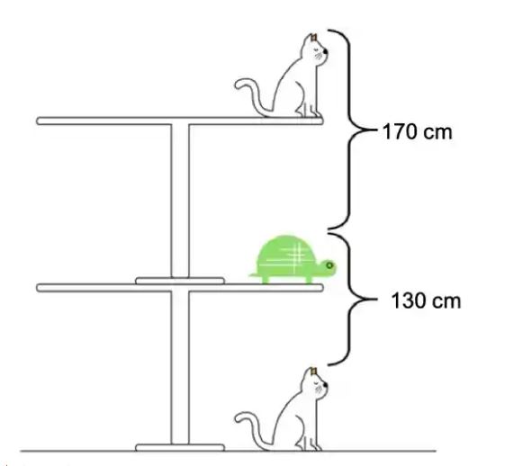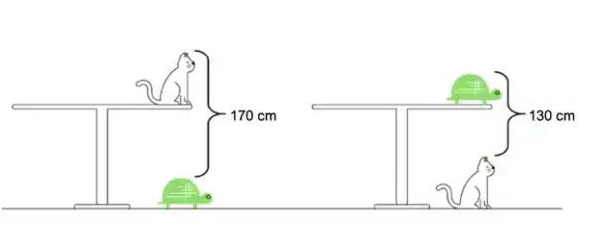 Όταν τα δύο ζωάκια αλλάζουν θέση και η χελώνα βρίσκεται πάνω στο τραπέζι με την γάτα να είναι ακριβώς από κάτω της, η απόσταση από τα αυτιά της γάτας μέχρι την κορυφή του κελύφους της χελώνας είναι 130 cm. Αυτό που σας ζητάει το τεστ είναι να υπολογίσετε ποιο είναι το ύψος του τραπεζιού.