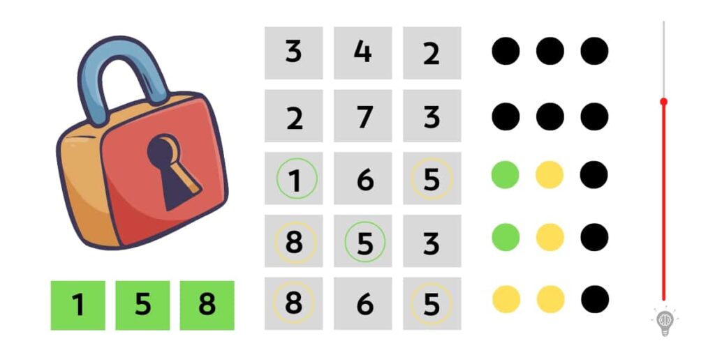 Το τεστ περιλαμβάνει σειρές με συνδυασμούς αριθμών που συνοδεύονται από χρωματιστές κουκκίδες που χρησιμεύουν ως ενδείξεις. Είναι απαραίτητο να κατανοήσετε τη σημασία αυτών των σημείων για να βρείτε τον σωστό 3ψήφιο κωδικό.