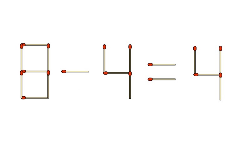 Μετακινήστε το κάθετο σπίρτο από το «+» στο 6. Το 6 μετατρέπεται σε 8 και η πρόσθεση σε αφαίρεση. Έτσι η ισότητα είναι σωστή, καθώς «8 – 4 = 4».