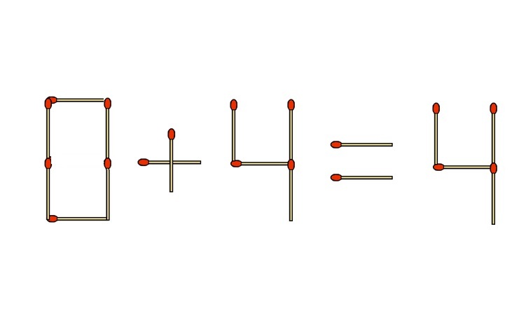 Μετακινήστε το κάθετο μεσαίο σπίρτο από το 6 στο αριστερό κενό του 6. Το 6 μετατρέπεται σε 0. Έτσι η ισότητα είναι σωστή, καθώς «0 + 4 = 4».