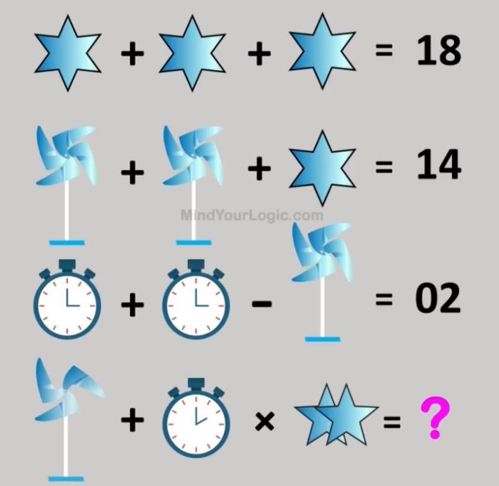 Η τελευταία εξίσωση είναι κάπως διαφορετική καθώς ο ανεμόμυλος έχει 3 λεπίδες και όχι 4, το ρολόι δείχνει 2 αντί για 3, και το αστέρι έχει 5 γωνίες και όχι 6. Ακολουθώντας την λογική έχουμε: