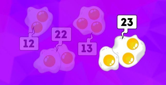 Σε κάθε αριθμό, το πρώτο ψηφίο αναπαριστά τα πόσα ασπράδια υπάρχουν και το δεύτερο ψηφίο πόσοι κρόκοι. Άρα ο αριθμός που λείπει είναι το 23 (2 ασπράδια και 3 κρόκοι).
