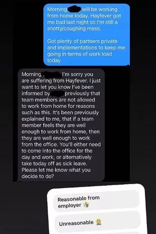 Το αφεντικό του έδωσε δύο επιλογές. Είτε να πάει στο γραφείο, είτε να πάρει άδεια ασθενείας. Δεν θα δεχόταν ο υπάλληλος να εργαστεί από το σπίτι λόγω της αλλεργικής ρινίτιδας που είχε. Ο διάλογος δημοσιεύτηκε σε μια σελίδα στο Instagram που ονομάζεται The Aussie Corporate.