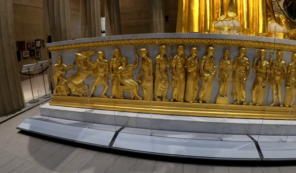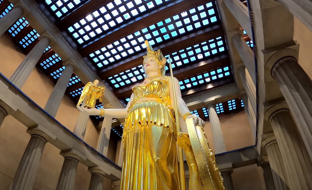 Περπατώντας ανάμεσα στους επιβλητικούς κορινθιακούς κίονες και κάτω από το στολισμένο με περίτεχνα γλυπτά αετώματα, οι επισκέπτες μεταφέρονται σε μια άλλη εποχή και κυρίως σε μία άλλη χώρα. Συγκεκριμένα στην Αρχαία Ελλάδα. Κάθε λεπτομέρεια του εξωτερικού του Παρθενώνα, αναδεικνύει την εξαιρετική δεξιοτεχνία των αρχαίων Ελλήνων. Το οικοδόμημα ενισχύεται περαιτέρω από το μεγάλο άγαλμα ύψους 12 περίπου μέτρων – και αυτό πιστό αντίγραφο του αγάλματος που υπήρχε εντός του Παρθενώνα στην Ελλάδα – που εκπέμπει χάρη, δύναμη και σοφία. Είναι το μεγαλύτερο άγαλμα εσωτερικού χώρου στο δυτικό ημισφαίριο. Χρειάστηκε οκτώ χρόνια για να ολοκληρωθεί και είναι δημιούργημα του διάσημου γλύπτη Alan Le Quire. Ολοκληρώθηκε και παραδόθηκε προς τέρψιν του φιλοθεάμονος κοινού το 1990, με μεγάλο μέρος του να είναι καλυμμένο με φύλλα χρυσού.
