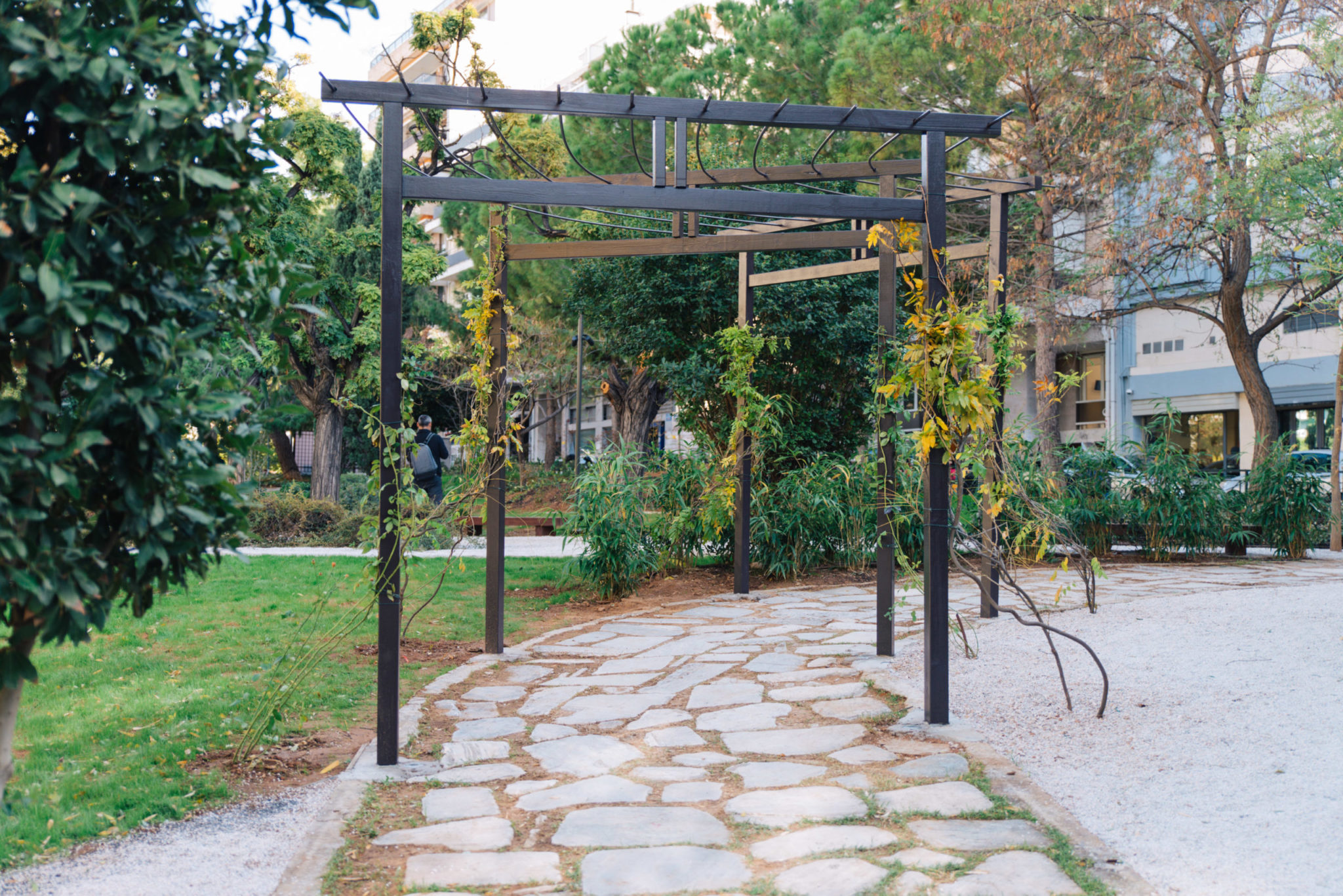 Στη μελέτη αυτού του καινοτόμου project συνυπολογίστηκε απαραιτήτως το αττικό κλίμα: Η επιλογή των φυτών βασίστηκε σε είδη που προέρχονται τόσο από την ιαπωνική όσο και από τη μεσογειακή χλωρίδα. Τα περίφημα Ιαπωνικά σφενδάμια, οι ανθοκερασιές και τα μπαμπού συνυπάρχουν στο πάρκο με αγγελικές, μυρτιές και δάφνες. Ο συνδυασμός των κλαδεμένων θάμνων με τους βράχους και τα βότσαλα διαμόρφωσαν «ήρεμα» μονοπάτια μέσα στον κήπο, ενώ τα κατασκευασμένα από γρανίτη καθιστικά, δημιούργησαν έναν όμορφο χώρο συνάντησης, προσφέροντας στους επισκέπτες του πάρκου τη δυνατότητα της απομόνωσης και της γαλήνης, στην «καρδιά» της πόλης.
