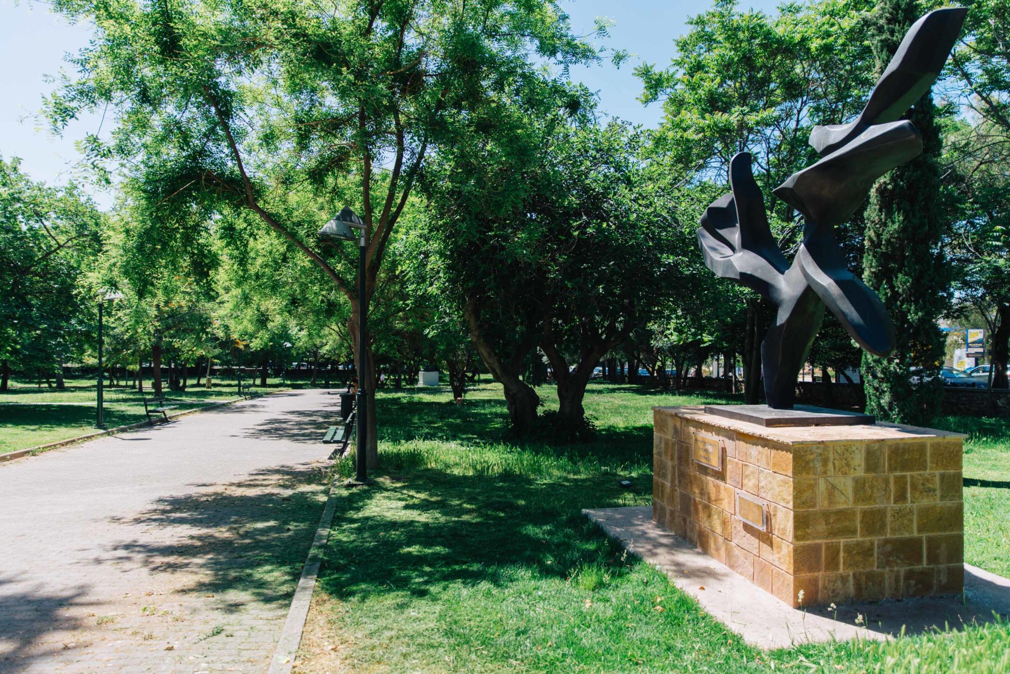 This park is a place of relaxation that visitors can explore by walking along the paved walkways, among the many trees, wonderful bushes, on the lawn that covers the largest surface of the park, as well rest on the benches, walk on the bridge over the pond with the ducks and gaze upon the various sculptures located in the area. And thanks to the sufficient lighting, all the above can be exprerienced either by day or by night.