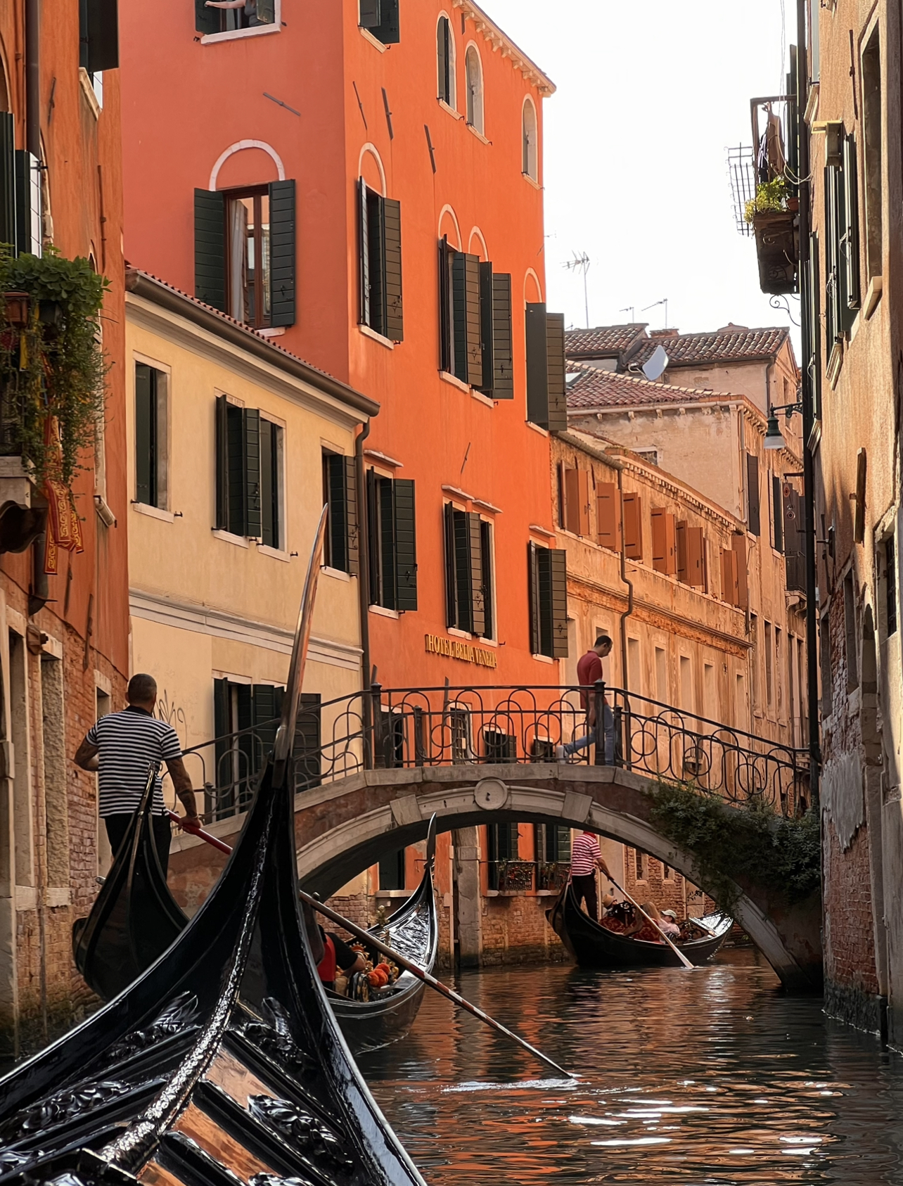 Τελευταία αλλά πιο σημαντική ήταν η βόλτα μας με την γόνδολα, το σύμβολο της Βενετίας. Για κάποιους ίσως μια βόλτα με τη γόνδολα να είναι υπερτιμημένη λόγω της τουριστικής της απήχησης, καθώς και για το κόστος της. Ύστερα από τη μισάωρη βόλτα μας, καταλήξαμε πως ήταν η πιο σωστή επιλογή. Δεν υπάρχουν λόγια να περιγράψουμε πόσο μαγικό είναι να βλέπεις αυτή την απίστευτα όμορφη πόλη καθώς η γόνδολα χαϊδεύει την επιφάνεια του νερού. Ο ήλιος ήταν ζεστός και μας συντρόφευε, ο γονδολιέρης μας τραγούδαγε ιταλικά τραγούδια – και ένα ελληνικό που του άρεσε πολύ! – και εμείς χαμογελούσαμε για όσα ζούσαμε εκείνη τη στιγμή. Θα χαρακτηρίζαμε ονειρική αυτή τη βόλτα, καθώς όλες οι αισθήσεις μας αφέθηκαν ελεύθερες και το μυαλό μας άδειασε από κάθε σκέψη.