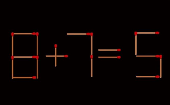 Το παρακάτω μαθηματικό παζλ εμφανίζεται η εξίσωση «8+7=5», με τα νούμερα και τα μαθηματικά σύμβολα να είναι κατασκευασμένα εξ ολοκλήρου από σπίρτα. Η εξίσωση είναι λάθος καθώς «8+7=15». Η αποστολή σας είναι να διορθώσετε αυτήν την εξίσωση για να είναι σωστό το αποτέλεσμα, μετακινώντας μόνο δύο σπίρτα.