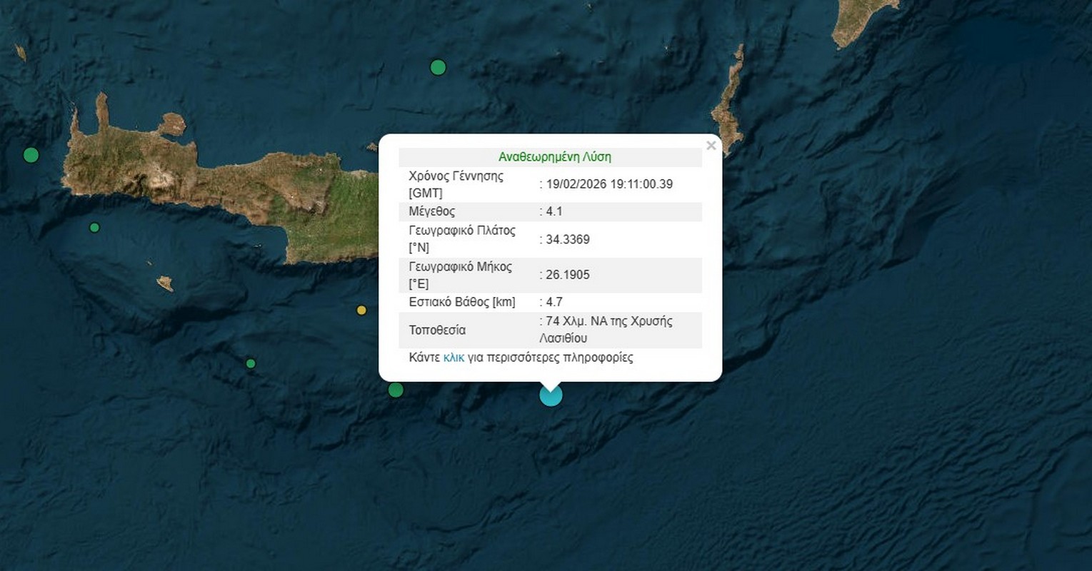 Σεισμός 4,1 Ρίχτερ νότια του Λασιθίου το βράδυ της Πέμπτης – Δεν εμπνέει ανησυχία σύμφωνα με τους σεισμολόγους