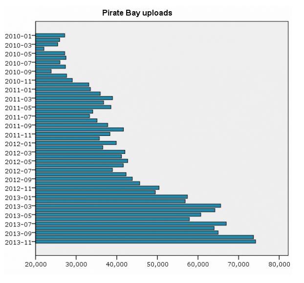 Όπως αποκαλύπτει η ιστοσελίδα TorrentFreak, στo «The Pirate Bay» σημειώθηκαν 50% περισσότερα πειρατικά uploads σε σχέση με το 2012, με τη δημοφιλή υπηρεσία να φιλοξενεί σήμερα περισσότερα από 2,8 εκατομμύρια αρχεία.