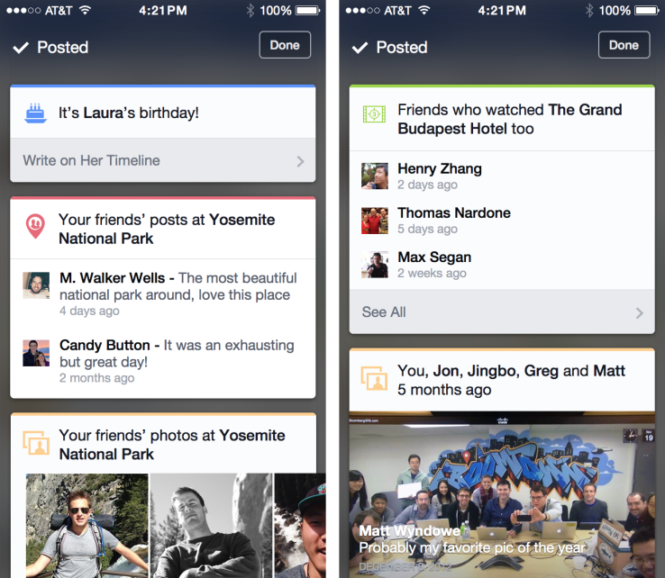 Σύμφωνα με το TechCrunch, η Facebook επίσης δοκιμάζει ένα νέο χαρακτηριστικό με την ονομασία Facebook Now που θα είναι παρόμοιο με την υπηρεσία Google Now της Google με την μορφή καρτών.