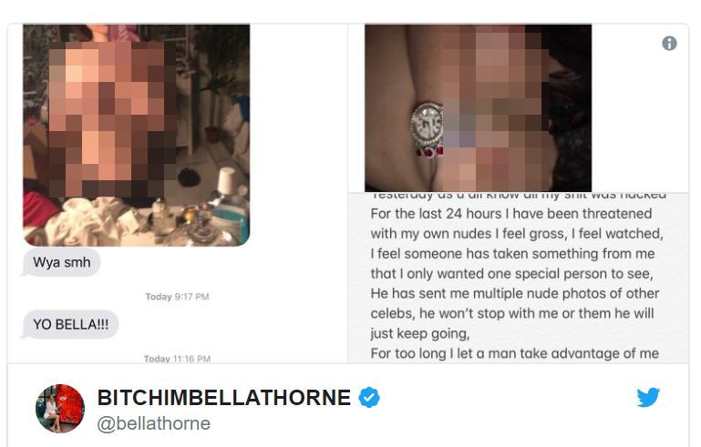 Η διάσημη ηθοποιός του Χόλιγουντ Μπέλα Θορν ανέβασε στον προσωπικό της λογαριασμό στο Twitter γυμνές φωτογραφίες της έπειτα από εκβιασμούς που δεχόταν από χάκερ.