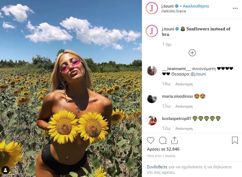 Στην Χαλκιδική βρέθηκε η Ιωάννα Τούνη, που «ανέβασε» μία φωτογραφία από μία έκταση με ηλιοτρόπια. «Πέταξε» λοιπόν τα ρούχα της και «ντύθηκε» με ηλιοτρόπια.Δείτε την φωτογραφία: