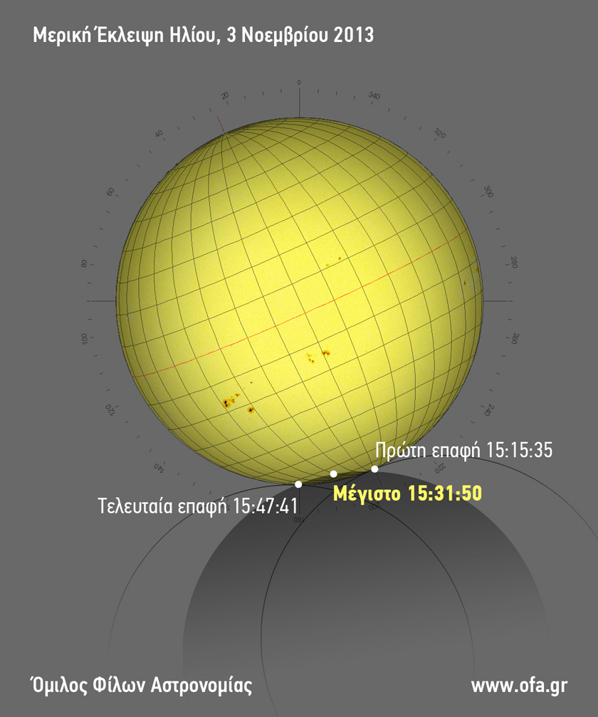 Μια σπάνια υβριδική έκλειψη (ολική και δακτυλιοειδής) θα συμβεί την Κυριακή 3 Νοεμβρίου, ορατή σαν μερική έκλειψη Ηλίου από την Ελλάδα. Η έκλειψη ξεκινάει σαν δακτυλιοειδής στον βόρειο Ατλαντικό, όπου ο κώνος της σκιάς δεν φτάνει μέχρι της επιφάνεια της Γης, λόγω της καμπυλότητάς της.