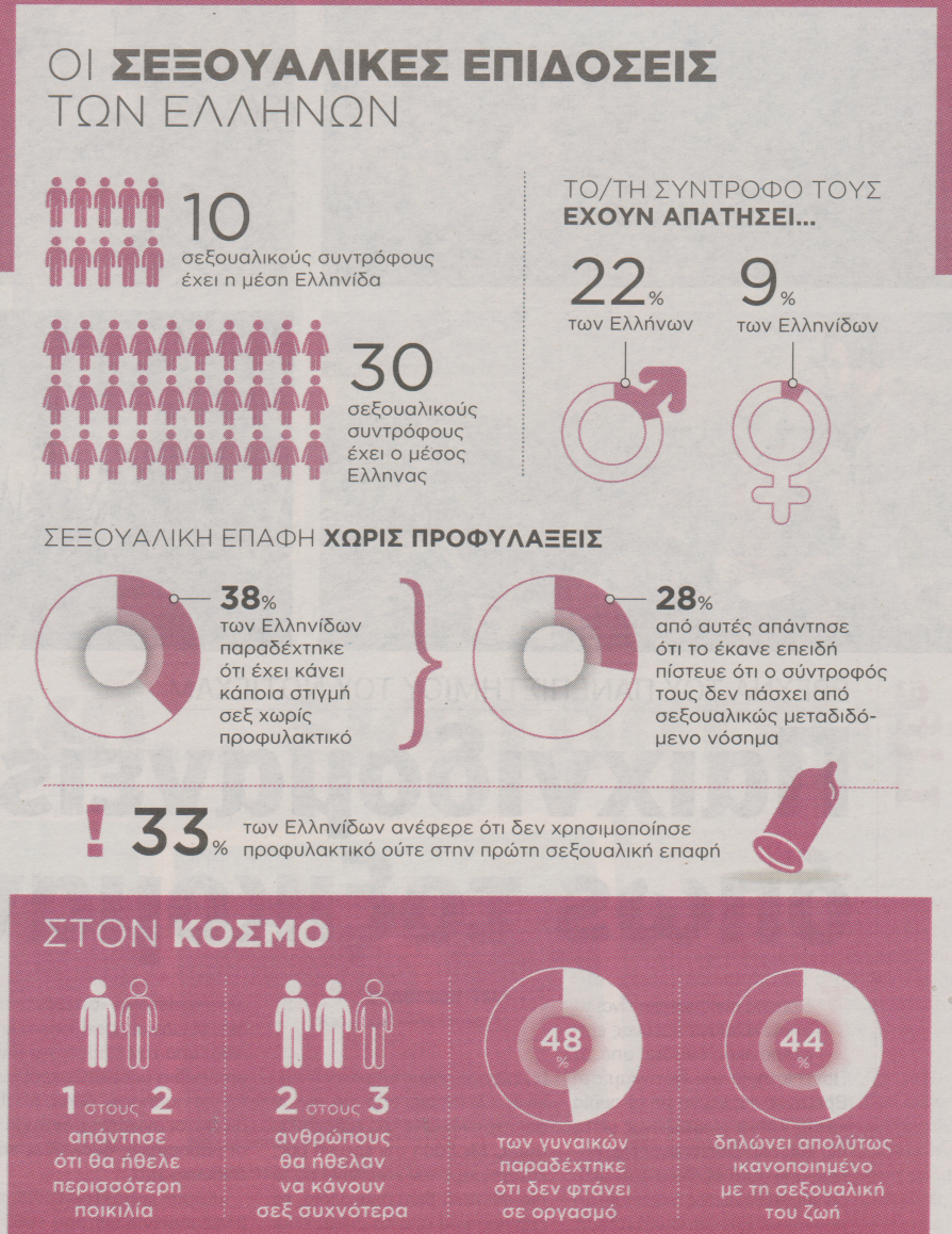 Τα στατιστικά στοιχεία που έδωσε στη δημοσιότητα εταιρεία προφυλακτικών, που συγκεντρώθηκαν με τη βοήθεια 26.000 εθελοντών από 26 χώρες του κόσμου, δείχνουν ότι τόσο οι άνδρες όσο και οι γυναίκες από την Ελλάδα έχουν έντονη σεξουαλική ζωή, παρά τα προβλήματα που μπορεί να αντιμετωπίζουν στον οικονομικό τομέα.