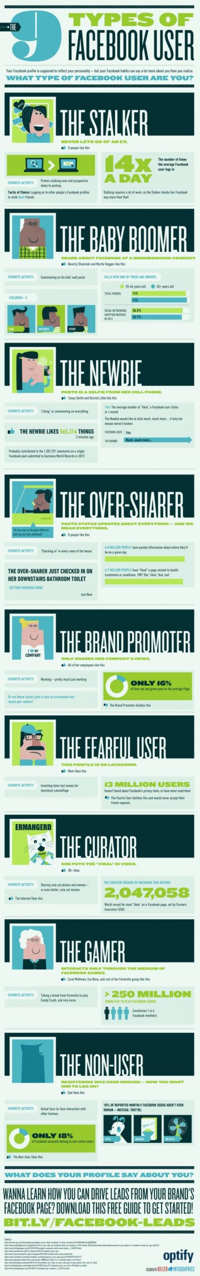 Η Optify είναι μια εταιρεία στην Αμερική, η οποία ασχολείται με το ηλεκτρονικό marketing και πρόσφατα δημιούργησε ένα πολύ ενδιαφέρον γράφημα για τους 9 πιο συνηθισμένου τύπους χρηστών του Facebook σύμφωνα με τα στοιχεία και της πηγές από τις έρευνες της.