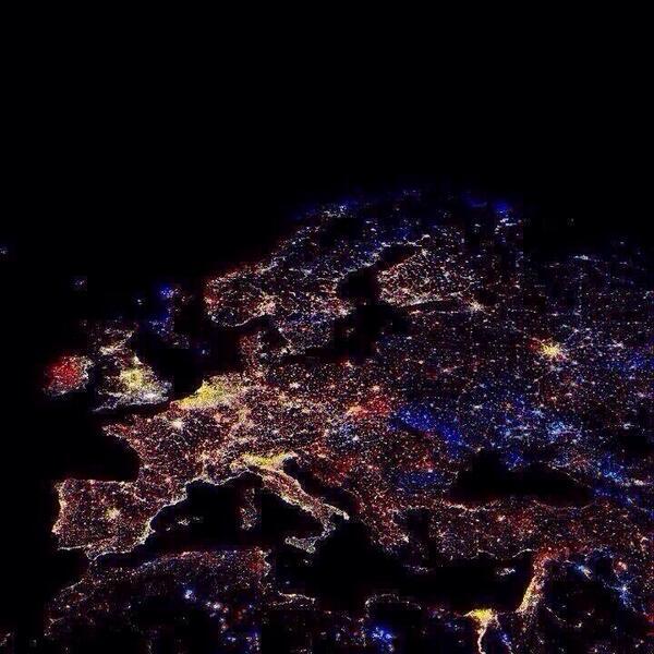 Εντυπωσιακή είναι η εικόνα της Ευρώπης όπως την δίνει αεροφωτογραφία που τραβήχτηκε τα μεσάνυχτα της 31ης Δεκεμβρίου του 2013. Η γηραιά ήπειρος «λουσμένη» στο φως όπως την βλέπουμε από το διάστημα.