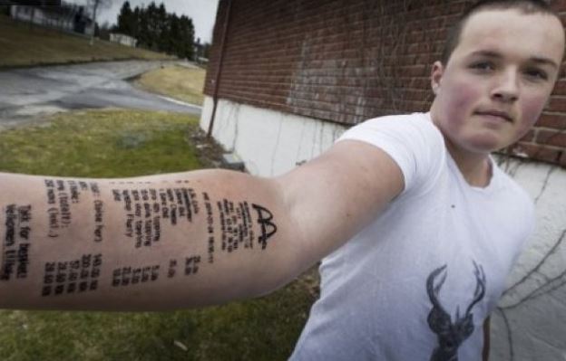 Ένα από τα πιο περίεργα τατουάζ που έχουν γίνει ποτέ είναι γεγονός εδώ και λίγες ημέρες. Όπως αποκάλυψε η ιστοσελίδα gawker.com ένας 18χρονος από τη Νορβηγία αποφάσισε, μετά από στοίχημα με φίλους του, να «χτυπήσει» στο δεξί του χέρι μία απόδειξη από γνωστή αλυσίδα ταχυφαγείων.