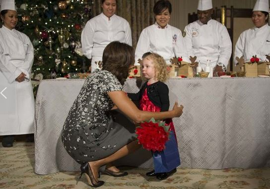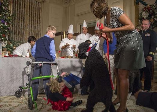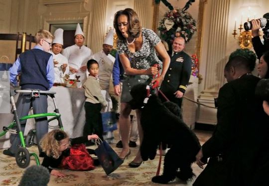 Το προεδρικό ζεύγος υποδέχθηκε στον Λευκό Οίκο στρατιωτικούς με τις οικογένειές τους και μία από τις… προσκεκλημένες ήταν η γλυκύτατη Άστιν, ηλικίας 2 ετών. Η μικρή βρήκε πολύ χαριτωμένη τη σκυλίτσα του Μπαράκ Ομπάμα, Σάνι, ωστόσο ενδεχομένως και να άλλαξε πολύ σύντομα γνώμη. Πάνω στη χαρά της που αντίκρισε μικρό παιδί, η Σάνι σηκώθηκε στα δύο πόδια και πλησίασε τη μικρή. Τελικό αποτέλεσμα; Την έριξε άθελά της στο έδαφος.