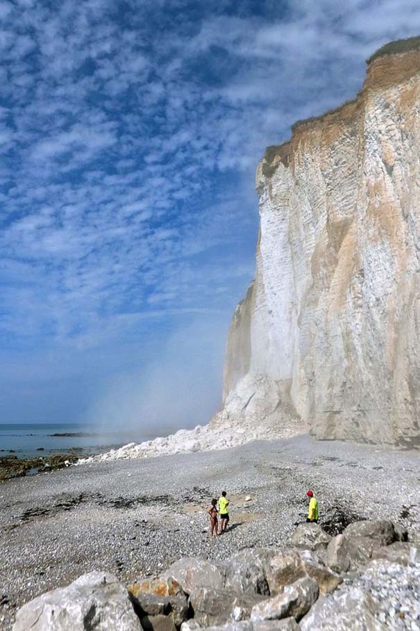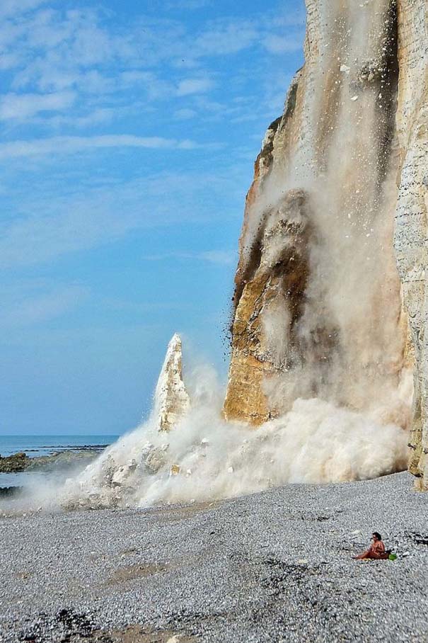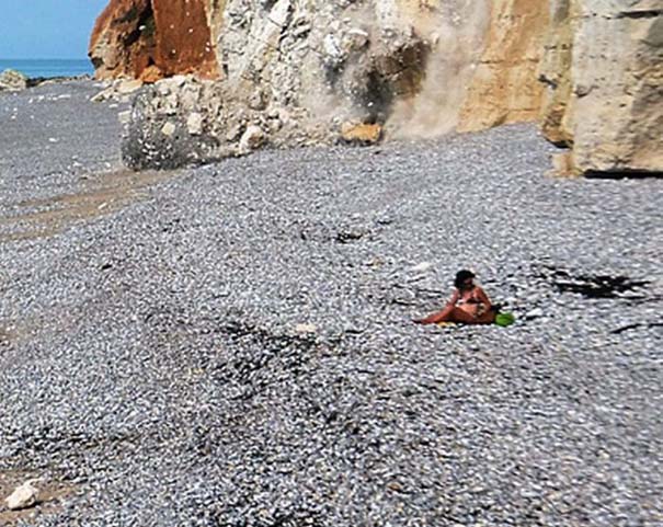 Ξαφνικά η πλαγιά που βρισκόταν πίσω της άρχισε να καταρρέει προκαλώντας μια τεράστια κατολίσθηση με ένα πυκνό σύννεφο από σκόνη. Η τυχερή γυναίκα δεν έπαθε απολύτως τίποτα αφού το τμήμα που κατέρρευσε βρισκόταν μερικά μέτρα μακριά της.