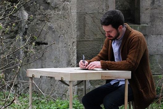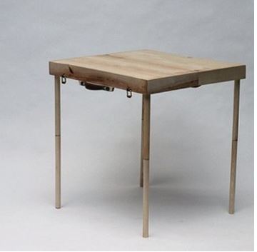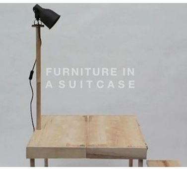 Με μερικές απλές κινήσεις η βαλίτσα μεταμορφώνεται σε ένα γραφειάκι που συμπληρώνεται από δύο σκαμπό και μία επιδαπέδια λάμπα.