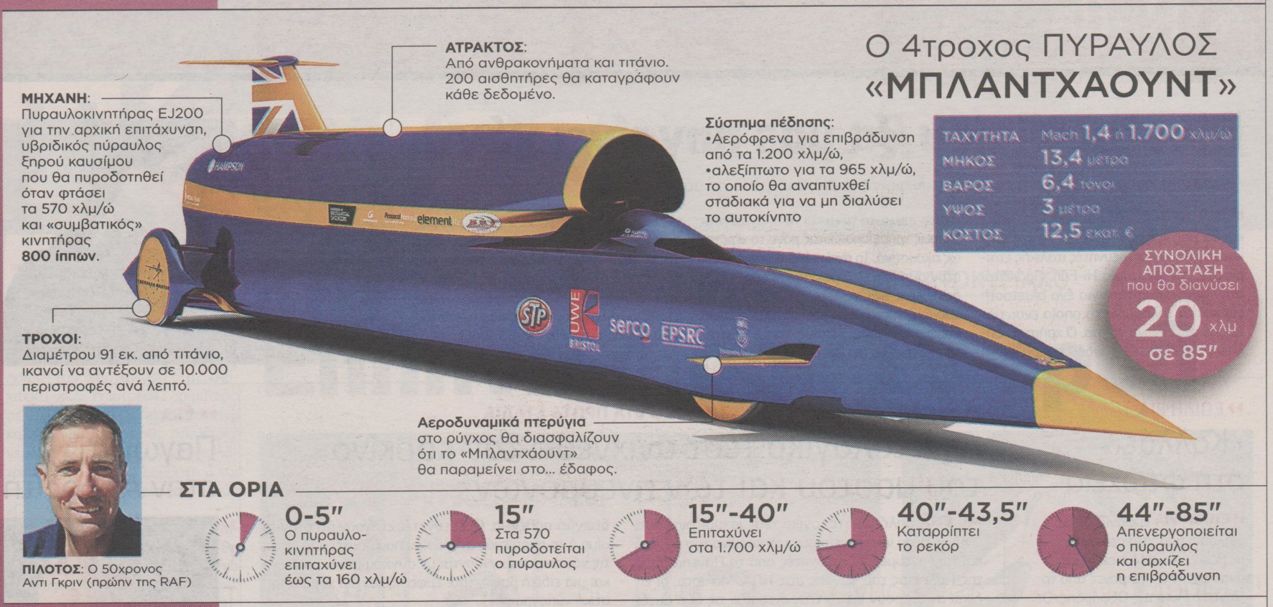 Σήμερα δοκιμάζεται για πρώτη φορά ο πυραυλοκινητήρας του υπερηχητικού αυτοκινήτου που φιλοδοξεί να καταρρίψει κάθε προηγούμενο ρεκόρ επίγειας ταχύτητας κατά μερικές… εκατοντάδες χιλιόμετρα φτάνοντας τα 1.700 περίπου χιλιόμετρα την ώρα ή περίπου 1,4 mach, με την ελπίδα όπως λένε οι δημιουργοί του, τουλάχιστον να μην… εκραγεί.Πρόκειται για το μήκος 13,4 μέτρων “Μπλαντχάουντ”, το οποίο έχει πάρει το όνομά του από την ομώνυμη ράτσα ιχνηλατών σκύλων, ένα πειραματικό υβρίδιο πυραύλου και τετράτροχου.Εξοπλισμένο με τρεις διαφορετικούς κινητήρες, έναν… συμβατικό που αποδίδει 800 ίππους, έναν πυραυλοκινητήρα που χρησιμοποιείται σε μαχητικά αεροσκάφη και έναν πύραυλο ξηρού καυσίμου, το υπερηχητικό αυτοκίνητο θα έχει ώση 27.500 λιβρών και συνολική ιπποδύναμη 80.000 ίππων, αντίστοιχη με εκείνη 95 αυτοκινήτων που αγωνίζονται στη Φόρμουλα 1.Διανύει 469 μέτρα το δευτερόλεπτο και ο πιλότος θα φορά ειδική στολή για να μη λιποθυμήσει από την επιτάχυνση.ΠΑΤΗΣΤΕ ΠΑΝΩ ΣΤΗ ΦΩΤΟΓΡΑΦΙΑ ΓΙΑ ΜΕΓΑΛΥΤΕΡΗ ΑΝΑΛΥΣΗ