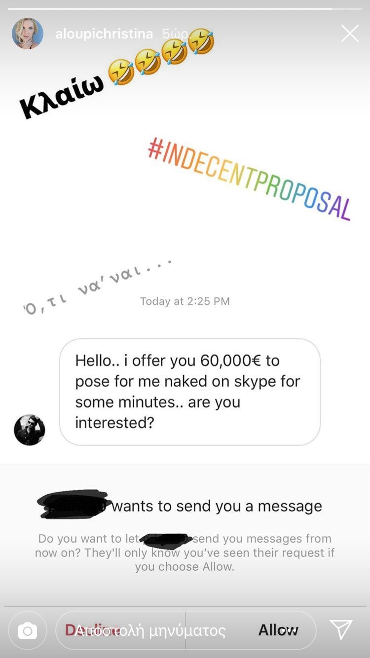 Όπως η ίδια έγραψε στον προσωπικό λογαριασμό της στο Instagram, άγνωστος της πρότεινε να ποζάρει γυμνή στο Skype για λίγα λεπτά έναντι 60.000 ευρώ.Η Χριστίνα Αλούπη αντιμετώπισε την ανήθικη πρόταση με χιούμορ και έγραψε χαρακτηριστικά «Κλαίω! Ό,τι να ‘ναι…»