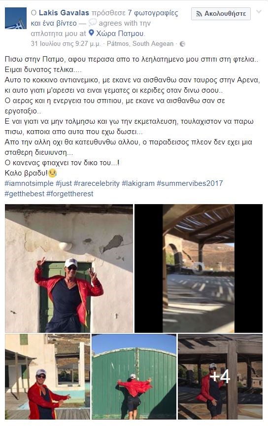 «Πίσω στην Πάτμο, αφού πέρασα από το λεηλατημένο μου σπίτι στη Φτελιά. Είμαι δυνατός τελικά… Αυτό το κόκκινο αντιανεμικό, με έκανε να αισθανθώ σαν ταύρος στην αρένα κι αυτό γιατί μου αρέσει να είναι γεμάτες οι κερκίδες όταν δίνω σόου.